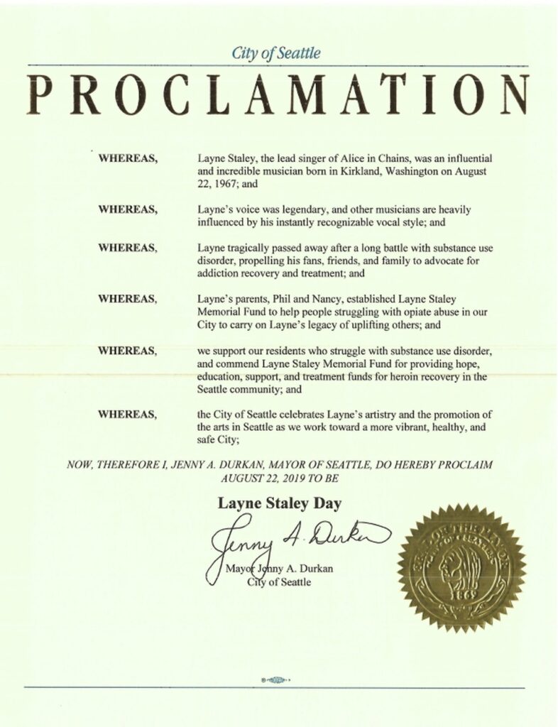 Jak wyjaśnia nadająca z Seattle radiostacja KEXP, nowo ogłoszony „Dzień Layne’a Staley’a to ukłon w stronę fundacji, którą w 2002 r. założyli rodzice legendarnego frontmana Alice In Chains. Fundacja Layne Staley Memorial Fund stara się pomagać pokonać nałóg uzależnionym od heroiny muzykom lokalnej sceny Seattle.